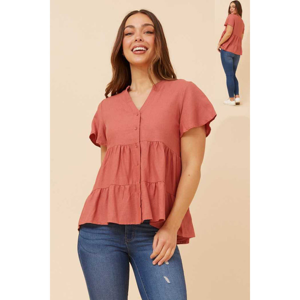 Effortless elegance meets versatile styling with this Tiered button-through top in a warm clay tone. The thoughtful layered design creates visual depth and dimension, while the full button front allows for customizable wear—button up completely for polished occasions or leave partially undone for relaxed sophistication. Crafted for the modern wardrobe, this piece transitions seamlessly from office to weekend, pairing beautifully with tailored trousers, denim, or skirts. A refined essential that elevates any ensemble.