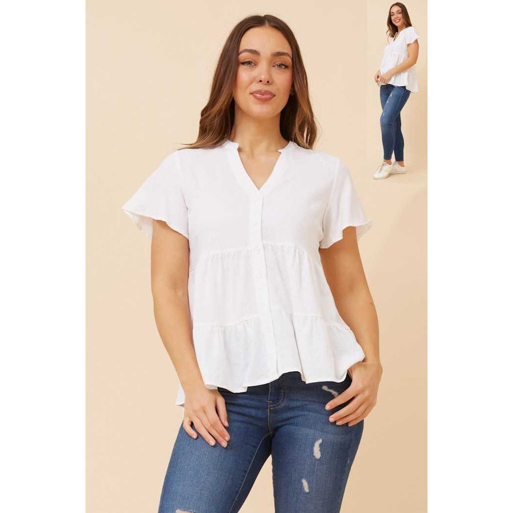 Effortless elegance meets versatile styling with this tiered button-through top in a warm white tone. The thoughtful layered design creates visual depth and dimension, while the full button front allows for customizable wear—button up completely for polished occasions or leave partially undone for relaxed sophistication. Crafted for the modern wardrobe, this piece transitions seamlessly from office to weekend, pairing beautifully with tailored trousers, denim, or skirts. A refined essential that elevates any ensemble.
