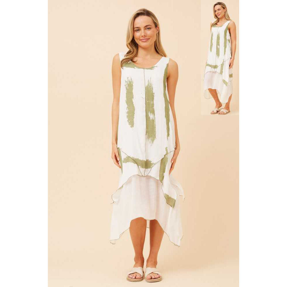 Effortlessly elegant, this layered dress in rich olive tones features a distinctive handkerchief hem that creates graceful movement and visual interest. The thoughtfully constructed layers add depth and dimension, while the asymmetrical hemline offers a contemporary edge perfect for both refined occasions and elevated everyday wear. A versatile piece that transitions seamlessly from day to evening, this dress embodies understated sophistication with its timeless silhouette and refined colour palette.