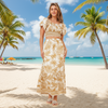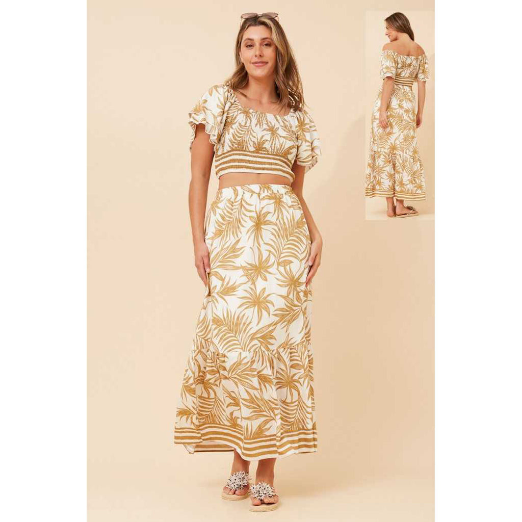 Elevate your wardrobe with this sophisticated gold and white printed top and skirt set. Featuring a timeless monochrome pattern, the coordinating pieces offer effortless elegance for both day and evening occasions. Crafted for a flattering fit, this set provides versatile style that seamlessly transitions from work to social events with refined grace.