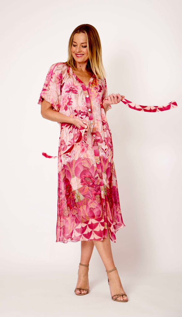 Elevate your wardrobe with this refined shirt dress, crafted from a luxurious blend of 70% silk and 30% viscose for a fluid, elegant drape. The distinctive Chinese collar adds an understated sophistication, while the slip-on silhouette with integrated belt creates a polished, effortless look. Rendered in a captivating multi-pink and fuchsia floral print, this versatile piece transitions seamlessly from office to evening occasions. Perfect for those who appreciate timeless design with contemporary flair.