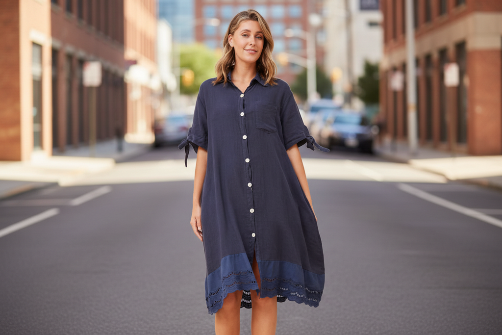 Effortless elegance meets timeless style with this navy linen dress. The breathable linen fabric provides comfort for warm weather, while delicate lace trim at the hem adds a refined, feminine touch. Perfect for casual outings or dressed up for special occasions, this versatile piece transitions seamlessly from day to evening. The classic navy hue pairs beautifully with any accessory, making it an essential addition to your wardrobe.