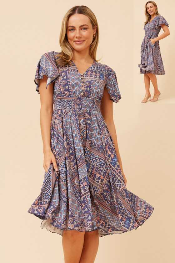 Elevate your wardrobe with this striking patchwork dress, where contrasting fabric panels create visual intrigue and movement. The delicate ruffle sleeves add a refined feminine touch, while the shortened silhouette offers modern versatility. Crafted in a sophisticated blue palette, this piece transitions seamlessly from casual daytime wear to evening occasions. Perfect for those who appreciate thoughtful design details and timeless style.