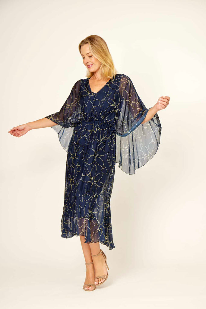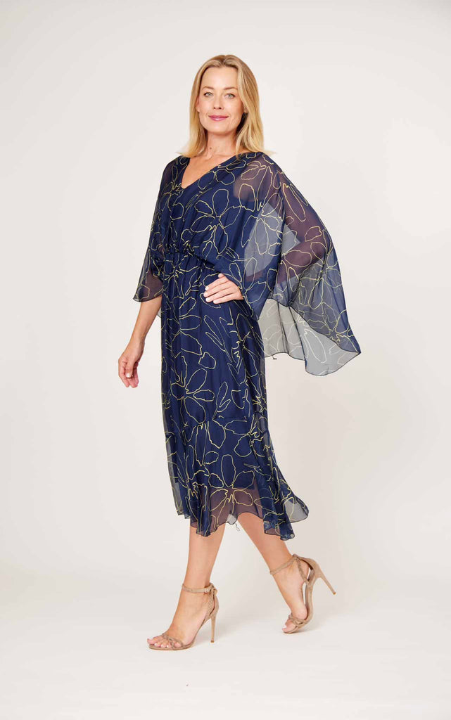 This elegant cape dress in navy and gold blends luxurious silk with soft viscose, offering a graceful drape and comfortable wear. Its refined fabric composition ensures a sophisticated silhouette, perfect for making a subtle yet striking statement at any formal occasion.